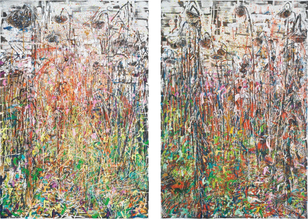 Anja Jerčič Jakob, Iz cikla Heliotropizem št.3 in št. 4 / Aus dem Zyklus Heliotropismus No.3 und No. 4, 2025, tuš, jajčna tempera, olje na platnu / Tusche, Eitempera, Öl auf Leinwand, 195 x 130 cm
