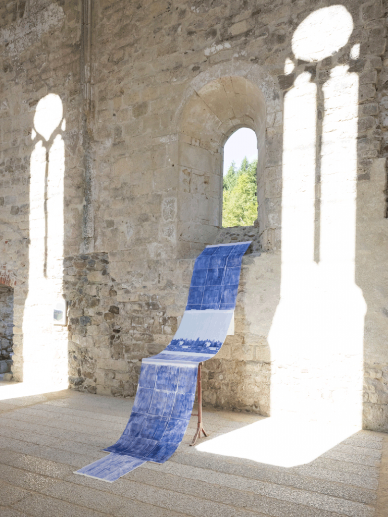 Traces, 2023 instalacija, transfer risba na tekstilu 600 × 90 cm Žička kartuzija, foto: Lucija Rosc