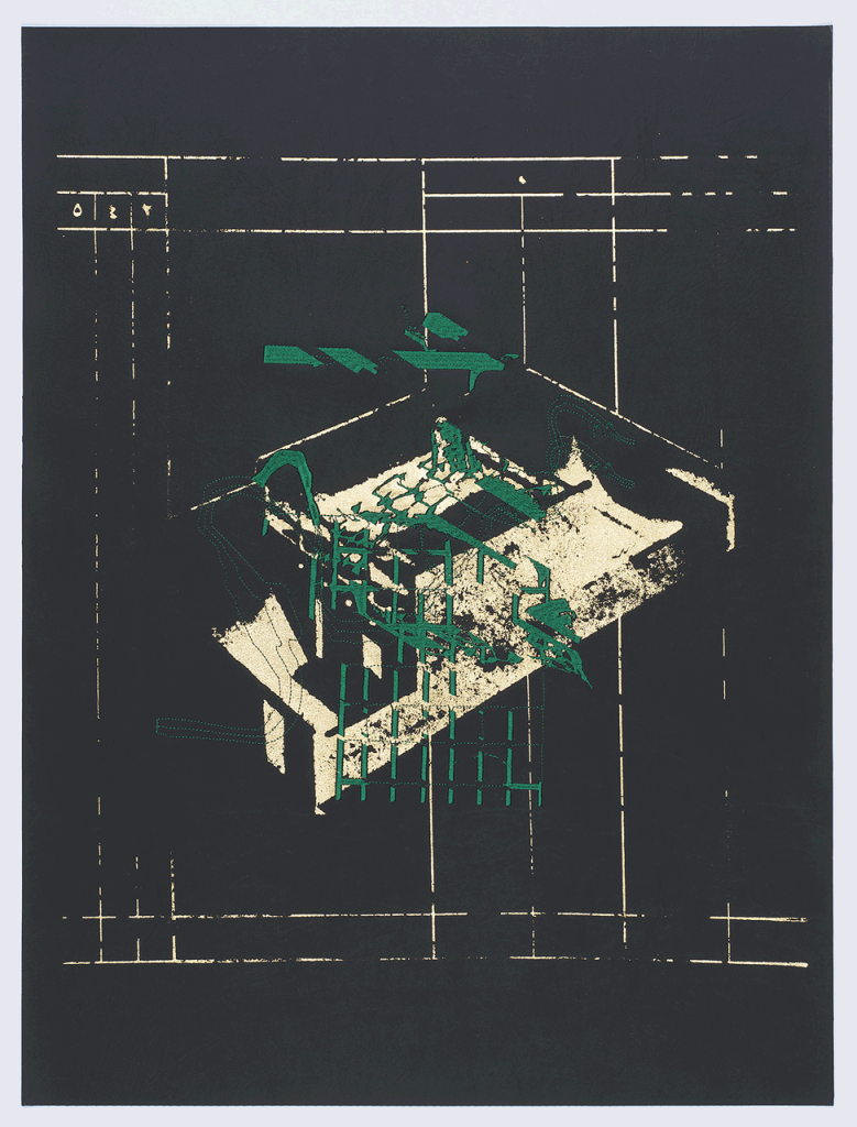 Grafika I (The Last Sector II), 2025 sitotisk, zlati lističi, digitalna vezenina na umetnem usnju 70 × 50 cm, foto: Jaka Babnik (arhiv MGLC)