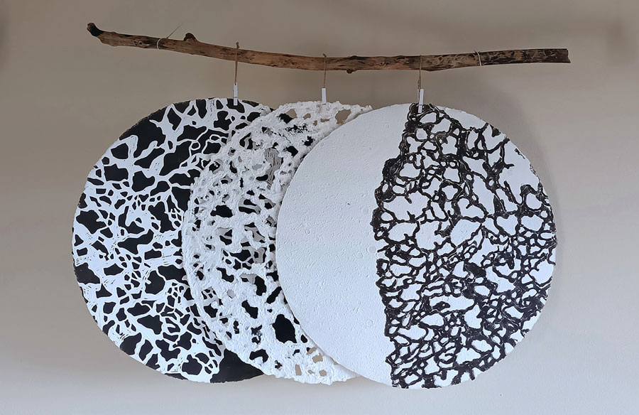 Tehnika: E.A., lesorez, kolagrafija, slikanje s papirno pulpo, ročno izdelan papir avtorja