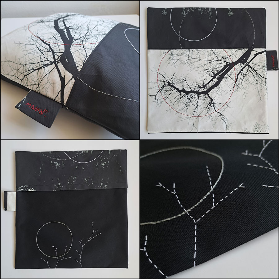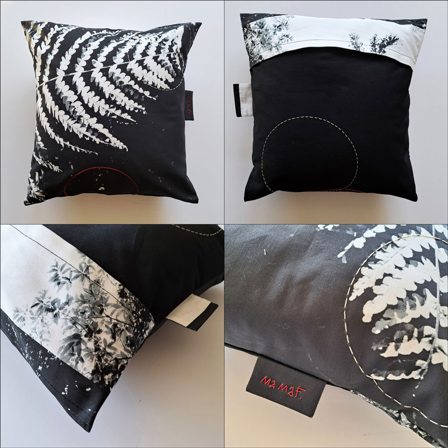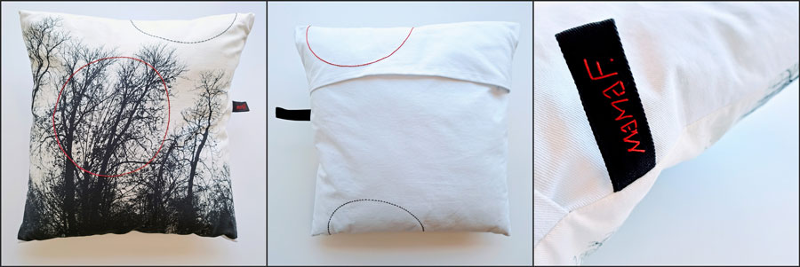Tehnika: Tekstilni objekt, blazina, digitalni tisk avtorske fotografije na platno in ročno vezene intervencije